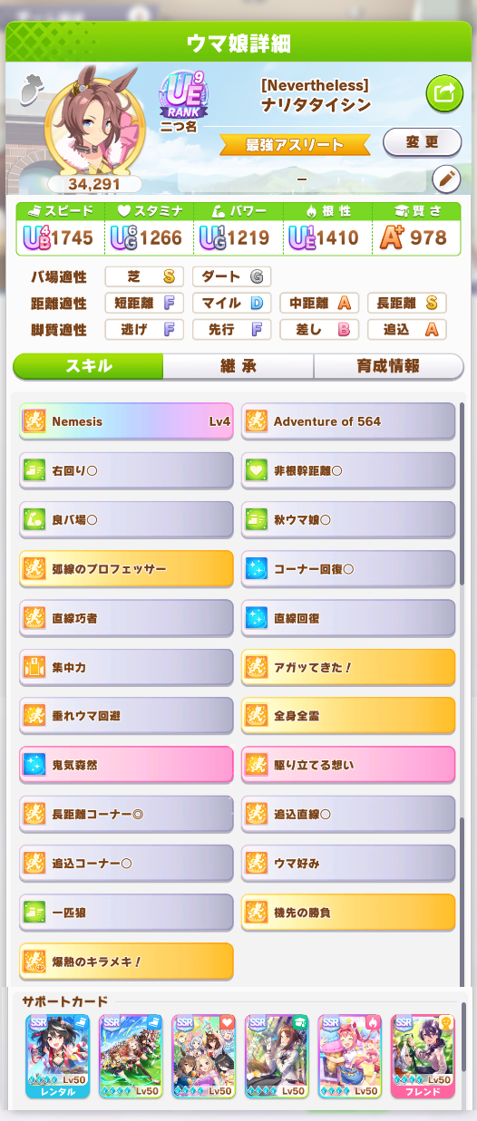 スピード1枚でカンスト、根性2枚でカンスト出来たのが要因ですね。