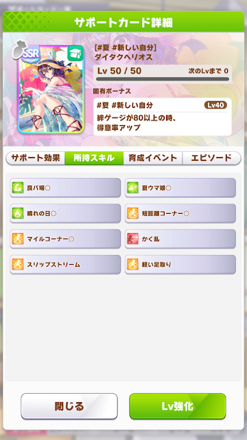 緑スキルは左回り、夏ウマ娘、良バ場、晴れの日、中京レース場、非根幹距離です。